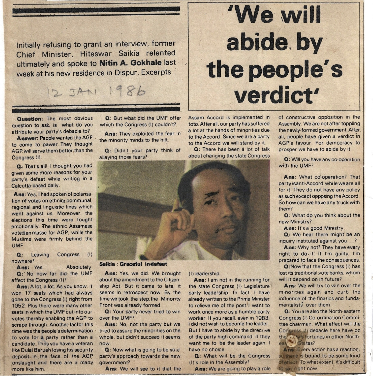 सकाळी 9 च्या सुमारास, माझे वडील, दूरदर्शनवर लाल किल्ल्यावरून पंतप्रधान राजीव गांधींचे स्वातंत्र्यदिनाचे थेट भाषण पाहत होते, त्यांनी मला गाढ झोपेतून जागे केले. “काहीतरी आसाम करार झाला आहे,” त्यांनी जाहीर केले. “पंतप्रधान त्याबद्दल बोलत असल्याचे मी नुकतेच ऐकले,” असे ते म्हणाले. मी आता झोपेतून पूर्णपणे जागा झालो होतो.