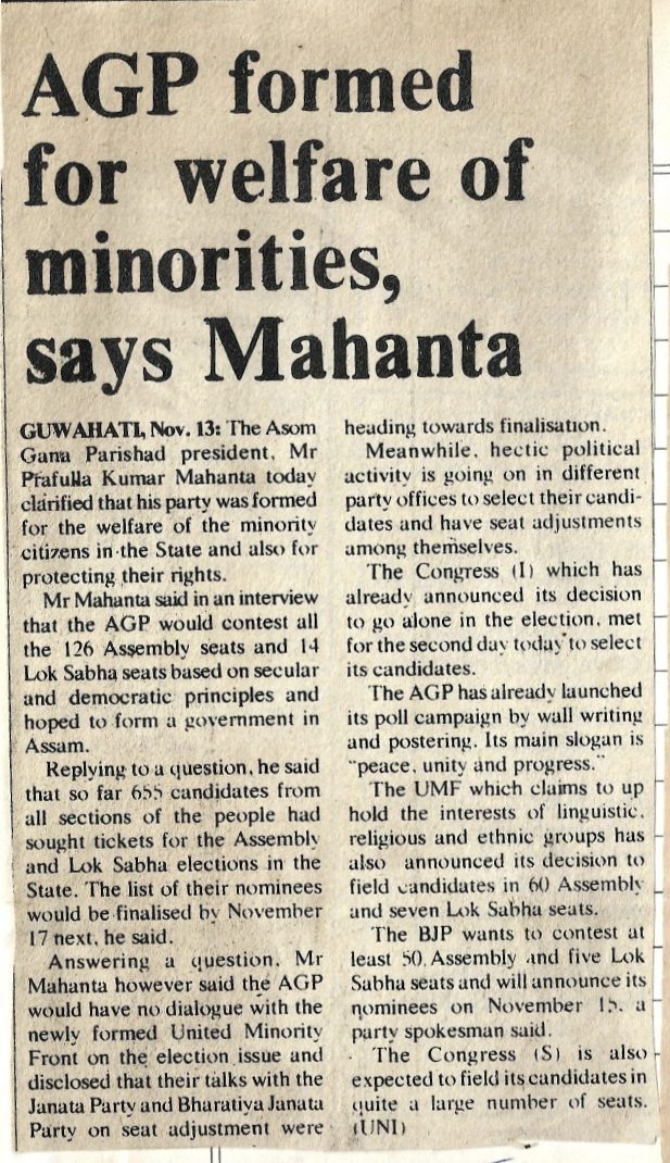 संपूर्ण राज्यात त्या वेळी चर्चा होती की, केंद्र सरकार आणि परकीयांविरोधातील आसाम आंदोलनाचे (फक्त आंदोलन नव्हे) लीडर, यांच्यात लवकरच एक ऐतिहासिक करार होणार आहे. अशा शक्यतेच्या पार्श्वभूमीवर, 13 आणि 14 ऑगस्ट रोजी आम्ही काही विश्लेषकांकडून संभाव्य परिणामांवर लेख मागवले होते. आम्ही 1979 पासून सुरू झालेल्या आंदोलनाची एक टाइमलाइन तयार केली होती आणि मागील सहा वर्षांतील घटनांचे फोटो शोधून ठेवले होते.