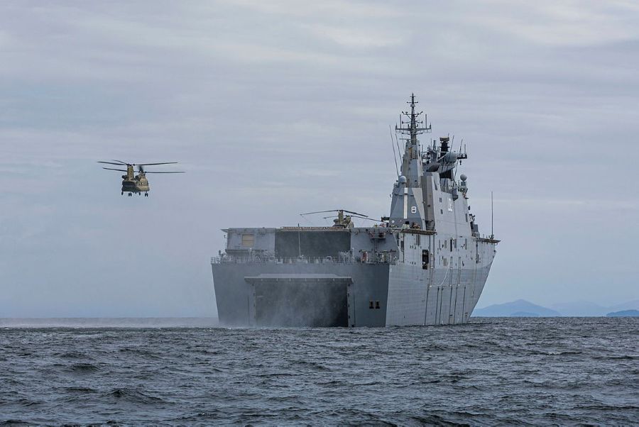 An Australian Army CH-47F Chinook prepares to land on HMAS Canberra flight deck off the coast of Queensland, during Exercise Sea WADER 2026