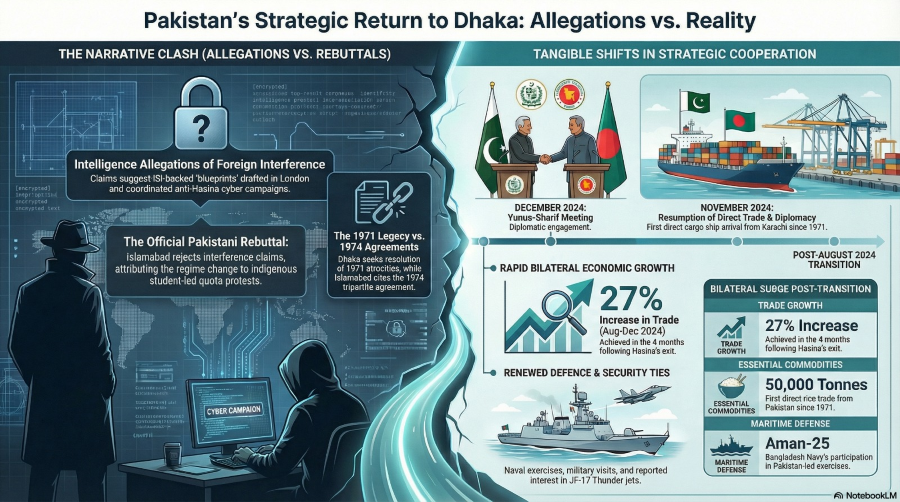 शेख हसीना यांच्या नेतृत्वाखाली, बांगलादेशचा परराष्ट्र आणि सुरक्षा दृष्टिकोन अग्निशामक म्हणून काम करत होता. पाकिस्तानशी लष्कर-ते-लष्करी संपर्क प्रभावीपणे गोठवण्यात आला होता, गुप्तचर सहकार्य कडकपणे मर्यादित करण्यात आले होते आणि सुरक्षेचा गैरफायदा टाळण्यासाठी आर्थिक सहभाग जाणूनबुजून मर्यादित करण्यात आला होता. 1971 च्या मुक्ती युद्धाचा निराकरण न झालेला वारसा केवळ ऐतिहासिक स्मृती म्हणून काम करत नव्हता तर बांगलादेशच्या राजकीय आणि संस्थात्मक जागेत पाकिस्तानी पुन:प्रवेशाच्या विरोधात एक संरचनात्मक अडथळा म्हणूनही काम करत होता.