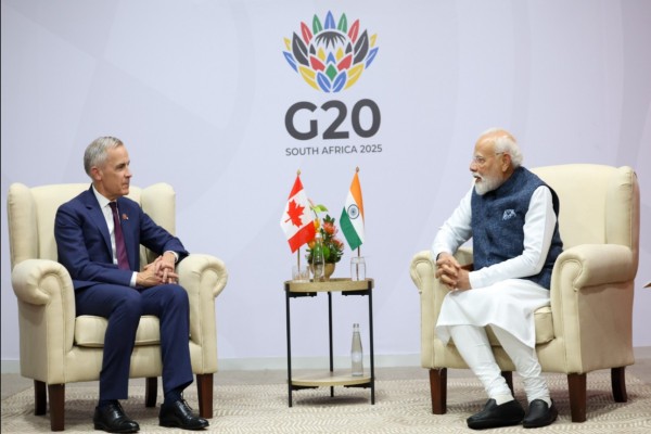 23 नोव्हेंबर, 2025 रोजी दक्षिण आफ्रिकेतील जोहान्सबर्ग येथे जी-20 शिखर परिषदेच्या निमित्ताने पंतप्रधान नरेंद्र मोदी कॅनडाचे पंतप्रधान मार्क कार्नी यांची भेट घेतली, त्यावेळचे छायाचित्र (फाइल फोटो).