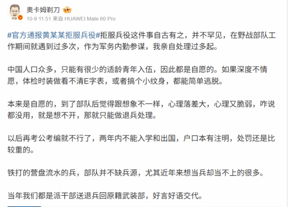 एका लिटल पिंकने लिहिले: “हुआंग मौमो याला लष्करी सेवेला नकार दिल्याबद्दल हद्दपार करण्यात आले आहे आणि कायमचे चिन्हांकित करण्यात आले आहे, सार्वजनिक परीक्षा देण्यासाठी त्याच्यावर आजीवन बंदी घालण्यात आली आहे. कायद्याची लाल रेषा म्हणजे विनोद नाही, असे निर्णय घेण्यापूर्वी काळजीपूर्वक विचार करा.”
