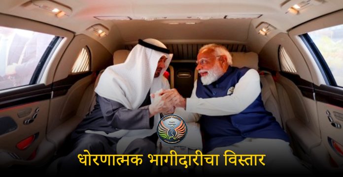 पंतप्रधान नरेंद्र मोदी आणि युएईचे अध्यक्ष शेख मोहम्मद बिन झायेद अल नाह्यान यांच्यातील चर्चेनंतर, भारत आणि युएई (संयुक्त अरब अमिराती) यांनी संरक्षण, ऊर्जा, अंतराळ, डिजिटल पायाभूत सुविधा आणि व्यापार या क्षेत्रांतील करारांसह आपल्या धोरणात्मक भागीदारीचा विस्तार केला.