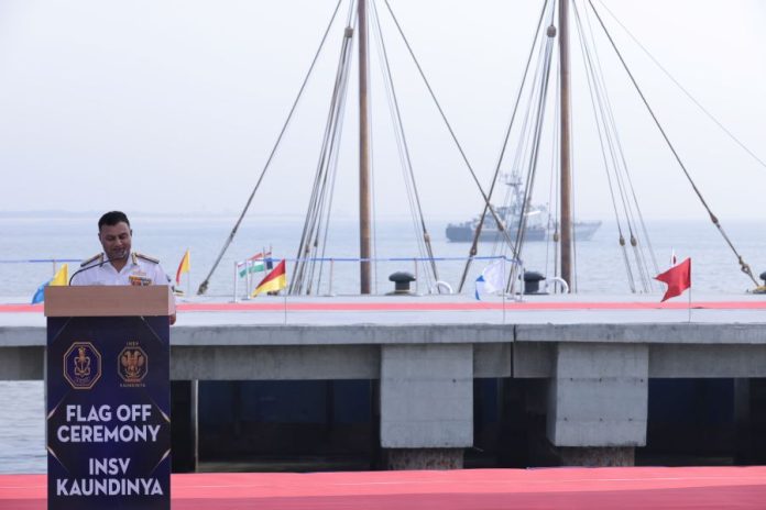 VAdm Krishna Swaminathan, C- in-C, Western Naval Command, formally flagged off INSV Kaundinya on maiden overseas voyage from Porbandar to Muscat on 29 December 2025