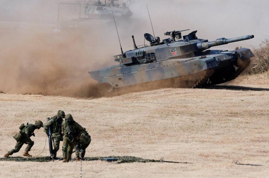 Japanese tanks operate during an annual New Year's military drill by the Ground Self-Defence Force at Narashino exercise field in Funabashi, Chiba Prefecture, on January 11, 2026