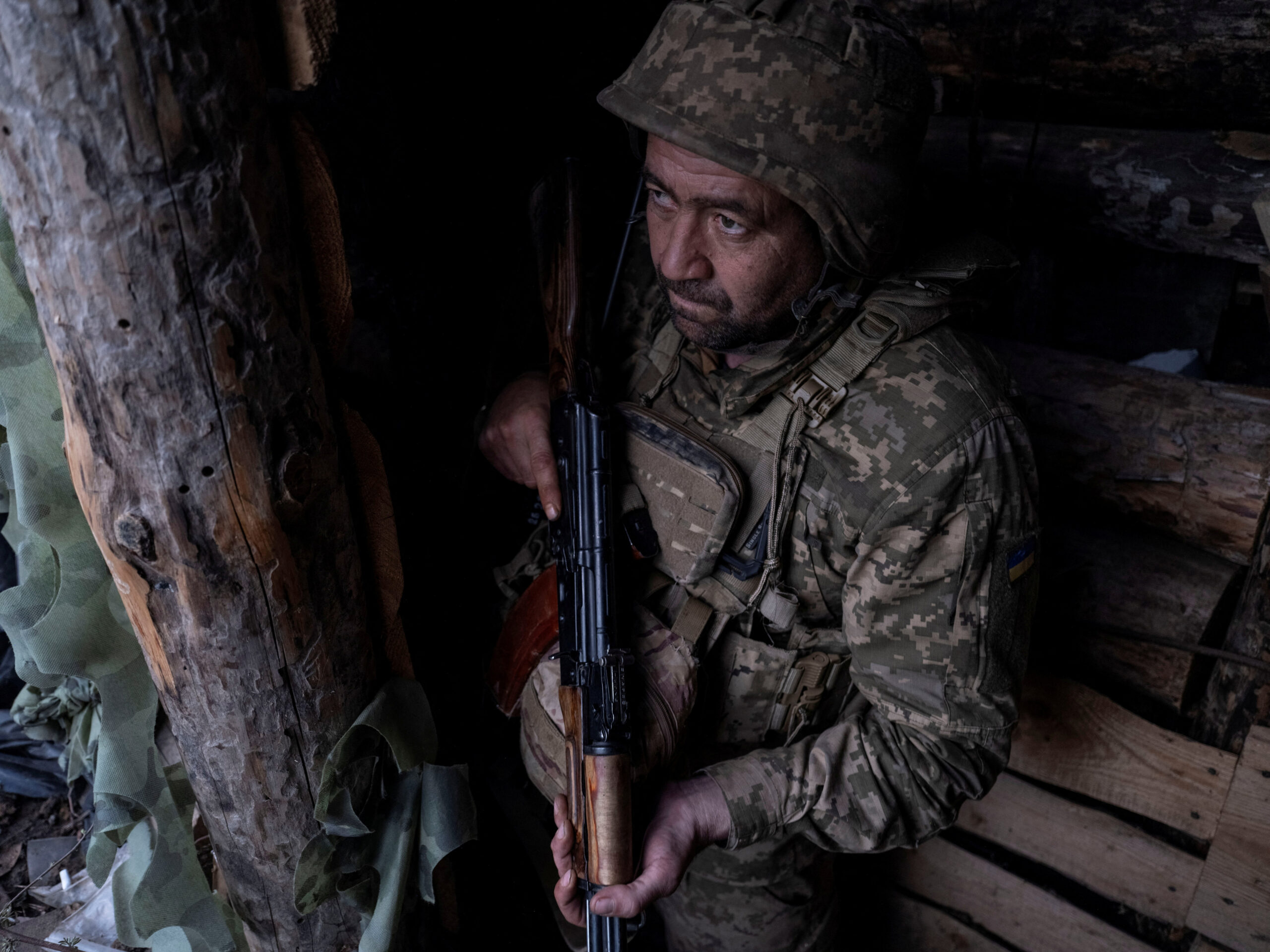 A serviceman of the 93rd Kholodnyi Yar Separate Mechanized Brigade of the Ukrainian Armed Forces looks out for Russian combat drones at an anti-drone position in the frontline city of Kostyantynivka, Donetsk region, Ukraine April 24, 2025. via REUTERS