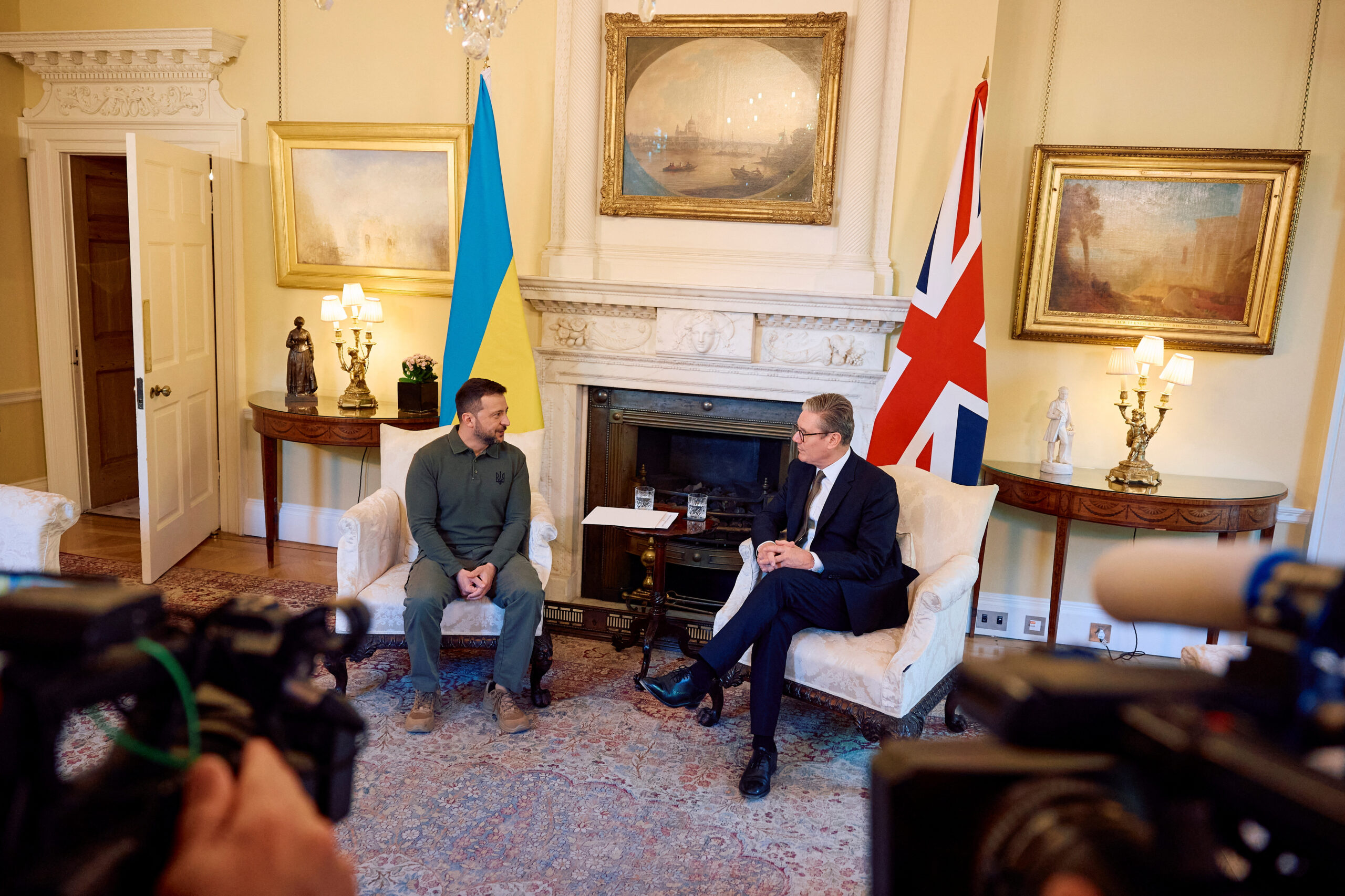 Britain's Prime Minister Keir Starmer and Ukraine's President Volodymyr Zelenskiy speak during a bilateral meeting at 10 Downing Street in central London, Britain, July 19, 2024. BENJAMIN CREMEL/Pool via REUTERS